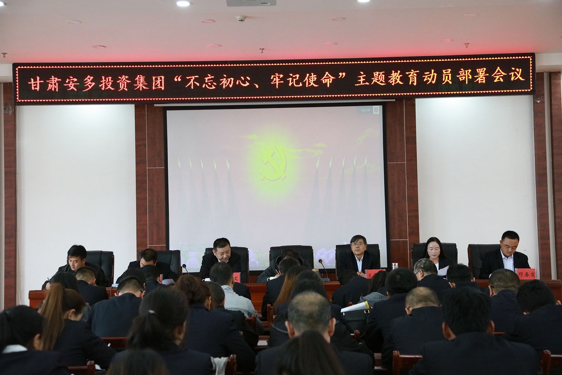 9月18日下午,甘肃安多投资集团召开“不忘初心、牢记使命”主题教育动员部署会议,夏河县人大常委会副主任、县委主题教育第十巡回指导组副组长马庆昌,小组成员王俊刚出席会议。 安多集团两委班子成员、全体党员、班组长及以上管理人员、集团总部机关全体工作人员近60多人参加会议,会议由集团公司党委委员、总经理谈江权主持。